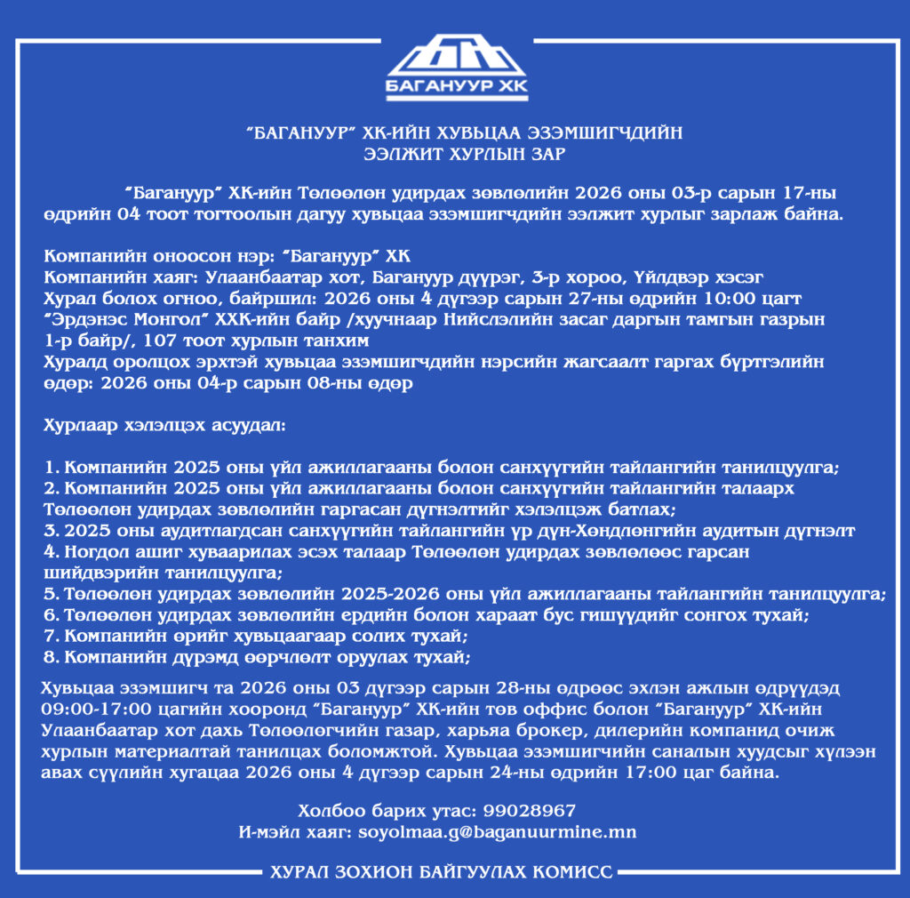 БАГАНУУР ХК-ИЙН ХУВЬЦАА ЭЗЭМШИГЧДИЙН ЭЭЛЖИТ ХУРЛЫН ЗАР Posted on 2026-04-062026-04-06 Tsagaan Previous Next Share this story! Share "БАГАНУУР ХК-ИЙН ХУВЬЦАА ЭЗЭМШИГЧДИЙН ЭЭЛЖИТ ХУРЛЫН ЗАР" on Facebook Post status "БАГАНУУР ХК-ИЙН ХУВЬЦАА ЭЗЭМШИГЧДИЙН ЭЭЛЖИТ ХУРЛЫН ЗАР" on Twitter